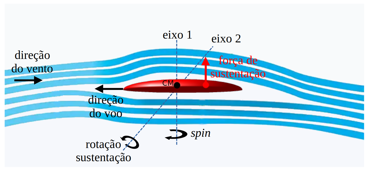 Repare que a força de sustentação surge devido ao escoamento do ar sobre e sob o frisbee e, portanto, se arremessarmos o disco sem rotação, ele deveria voar para longe similar a um aviãozinho de papel. Porém, nossa experiência nos diz que isso não é verdade e ao lançarmos o disco sem rotação, ele simplesmente irá rotacionar em torno de um eixo paralelo ao plano do frisbee (eixo 2) e atingir rapidamente o solo. O disco “capota” no ar e cai. O que ocorre é que a posição onde a força de sustentação é aplicada não se localiza no centro do disco ou centro de massa (CM na figura). Existem vários fatores que influenciam onde irá surgir essa força, como a maneira na qual o frisbee é lançado (ângulo de ataque), velocidade do arremesso, efeitos de turbulência, etc. A força de sustentação pode ser aplicada mais próxima a borda “dianteira” ou da borda “traseira” do disco, tomando como referência a direção do voo. Vamos supor que a força de sustentação esteja aplicada mais próxima a borda traseira, como na figura acima. Esta força irá aplicar um torque no frisbee, rotacionado-o em torno do eixo 2 e fazendo-o mergulhar em direção ao solo. E é aqui que o segundo conceito físico entra, a estabilidade giroscópica.