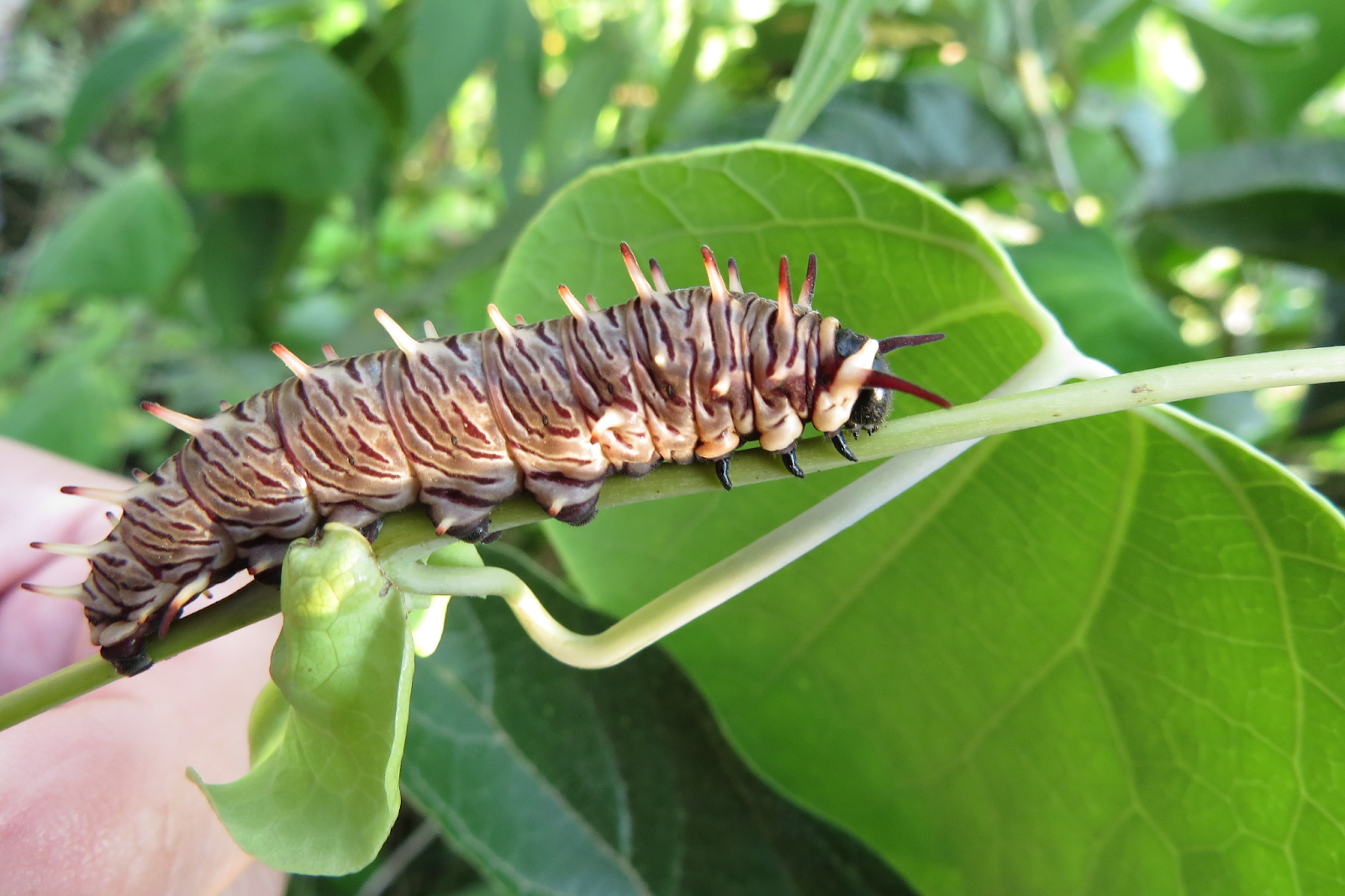 Figura 3. Lagarta de Battus polydamas polydamas (Linnaeus, 1758) (Lepidoptera:Troidini) se alimentando de Aristolochia hypoglauca Kuhlm. Foto: Joelcio Freitas.