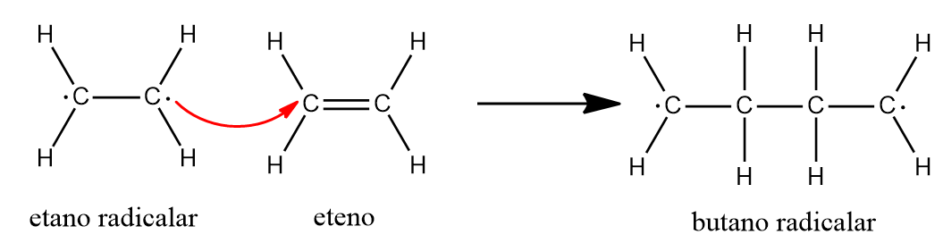 Com a adição de um composto químico, chamado catalizador, capaz de quebrar a ligação dupla entre os carbonos, tem início uma reação em cadeia, em que uma molécula de etano radicalar (formada após a quebra da ligação dupla na molécula de eteno – um radical, sim, o mesmo que dos radicais livres, é indicado por pontos na estrura química) reage com uma molécula de eteno, formando o butano radicalar, que por sua vez encontrará outra molécula de eteno, e assim consecutivamente: