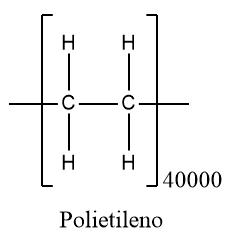 Você pode estar se perguntando como representar a estrutura química de um composto tão grande, teríamos que escrever todos os átomos da cadeia? Ainda bem que não! A representação de uma cadeia de polímero é feita a partir da estrutura de repetição (o monômero) entre colchetes, com uma ligação química de cada lado, identificando qual átomo está ligado ao próximo monômero e, por fim, a indicação do número de repetições deste monômero. No caso do polietileno, temos a estrutura de repetição com dois carbonos, ligados por ligação simples, e quatro hidrogênios: