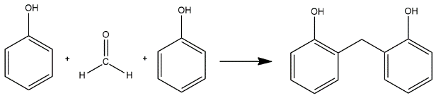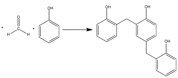 A resina fenólica é uma mistura de dois monômeros, o fenol com o formaldeído. A reação de síntese também varia, não é mais uma adição radicalar, agora é o processo de condensação, que possui como característica a formação de uma molécula de água durante a formação de ligação entre o fenol e o formaldeído. Observe, a seguir, que no inicio da reação, os fenóis se ligam entre si através do carbono da posição 2, ou orto, porém, essa posição não é exclusiva, como visto na segunda adição, onde é utilizada a posição 4, ou para, para se ligar à nova molécula de fenol.