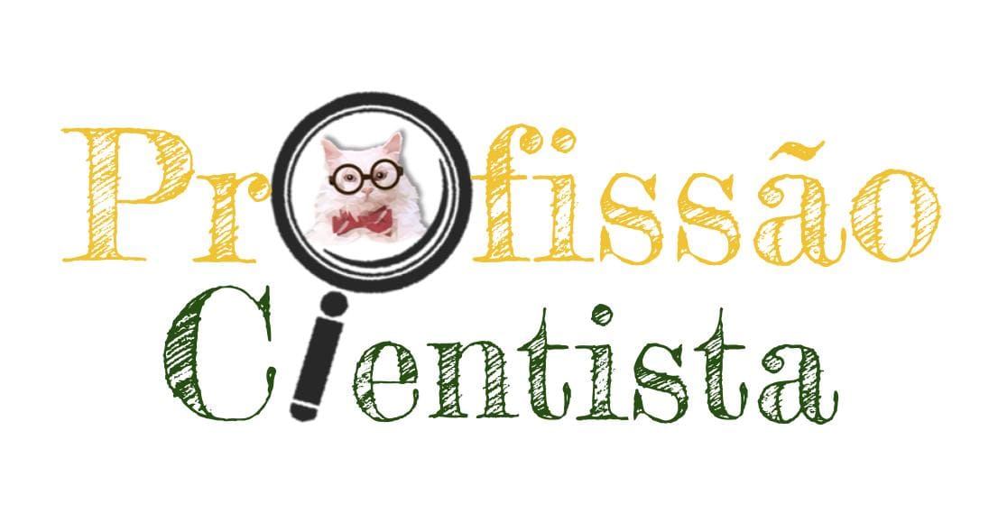 #acessibilidade Logo do Profissão Cientista, com profissão escrito em amarelo com letras que simulam rabiscos de canetinha e cientista escrito da mesma forma em verde embaixo. A primeira letra O de profissão e a primeira letra I de cientista são formadas por uma lupa, sento a lente a letra O e o cabo a letra I, com uma gato branco de óculos e gravata borboleta vermelha atrás da lente.