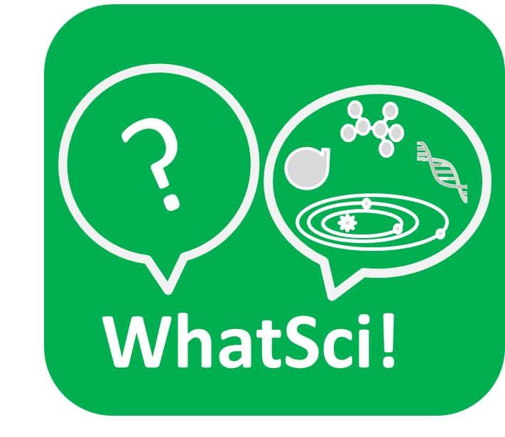 #acessibilidade Imagem de um quadrado verde claro de cantos arredondados com o nome WhatSci! escrito em branco na parte de baixo e dois balões de fala logo acima dele, o da esquerda com um ponto de interrogação e o da direita símbolos científicos como a dupla hélice do DNA.